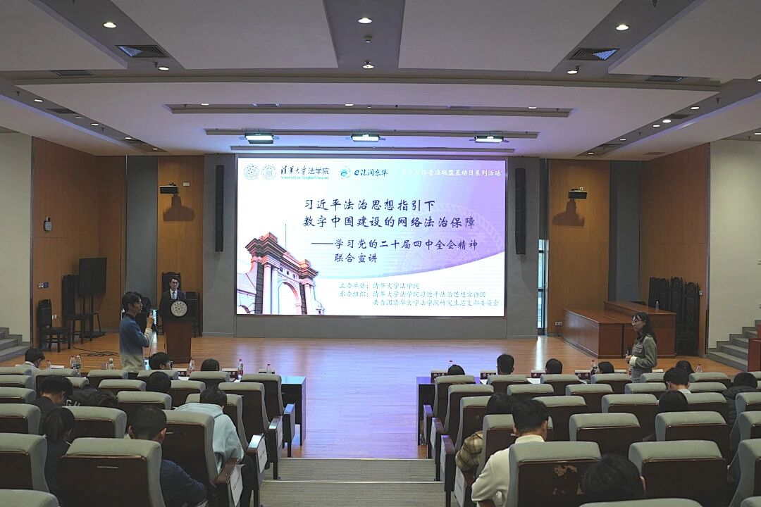 为深入学习党的二十届四中全会精神,2025年11月9日下午,清华大学法学院习近平法治思想宣讲团联合法学院研团总支、网络研究院研团总支、材料学院研团总支、万科公共卫生与健康学院研团总支以及生命科学学院研团总支在法律图书馆模拟法庭共同开展主题团日活动,活动主题为“习近平法治思想指引下数字中国建设的网络法治保障——学习党的二十届四中全会精神”。