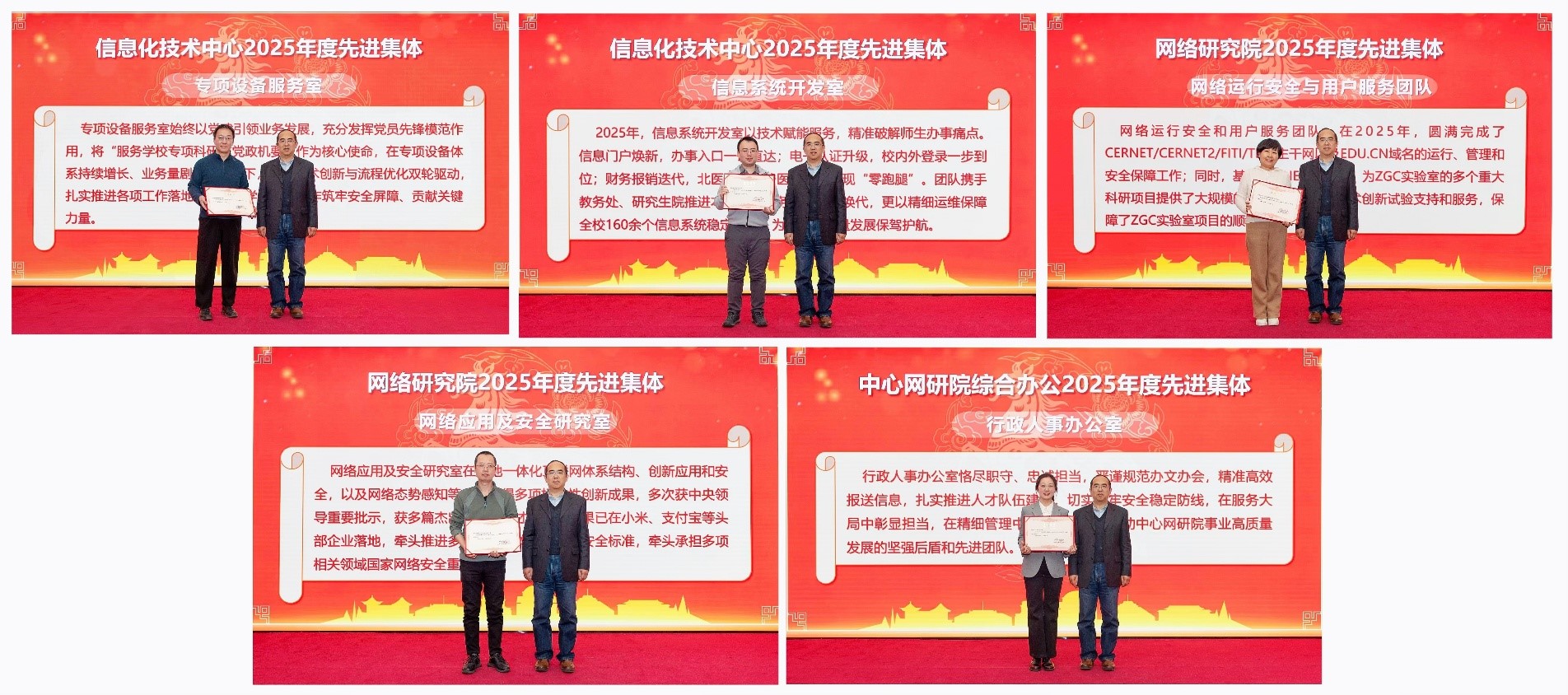 中心(院)党委副书记吴茜宣读了《信息化技术中心和网络研究院关于表彰2025年度先进工作者和先进集体的决定》,并向他们表示祝贺。谢素萍、李钟辉、黄蕾、张晗分别作为先进集体代表和先进个人代表上台交流发言。