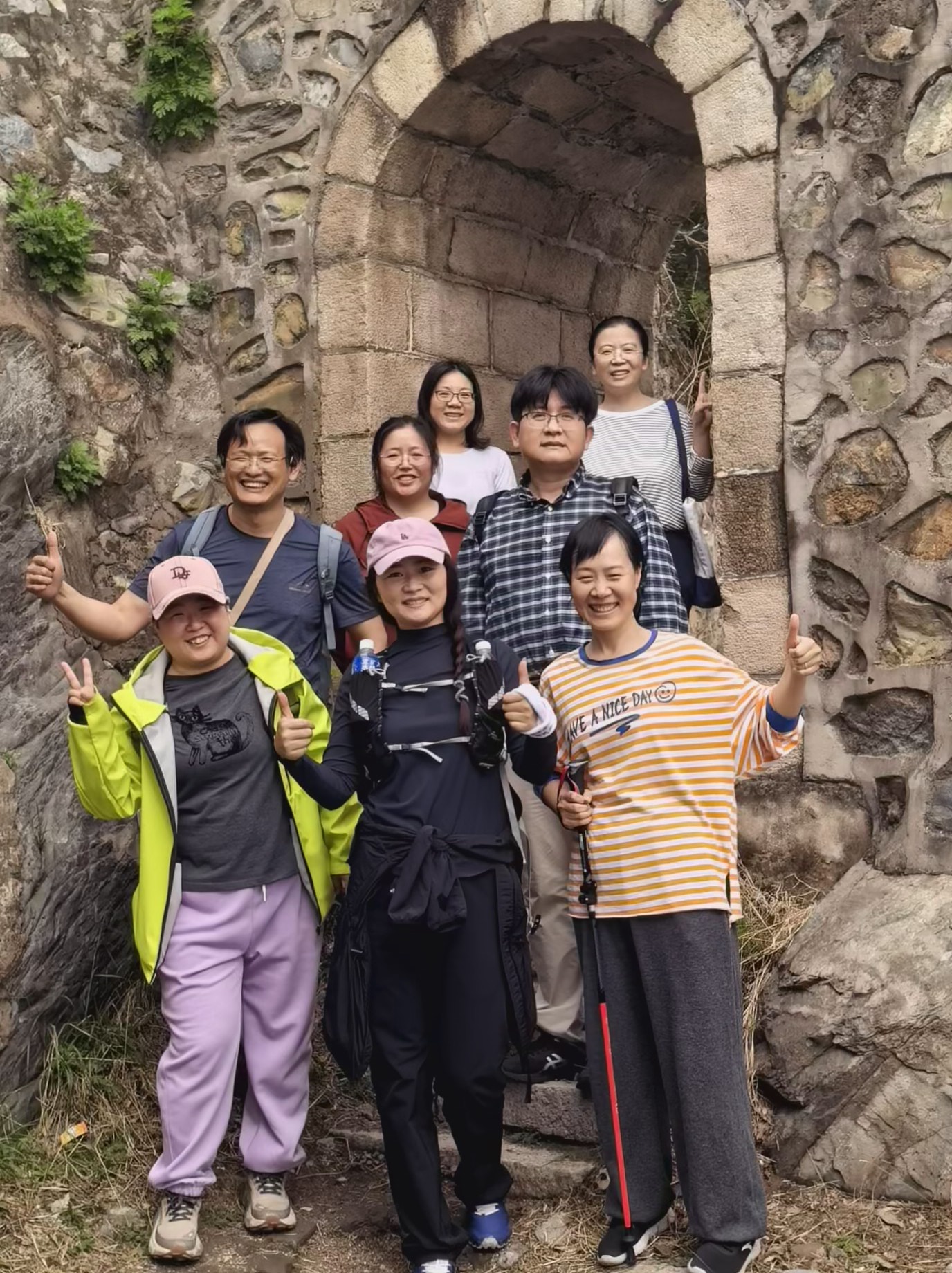 登山途中,大家根据体力自然分组、结伴前行。山间空气清新、大家沿途闲谈交流、放松身心、相互分享登山技巧,彼此加油鼓劲。最终全员顺利登顶并集体合影留念。